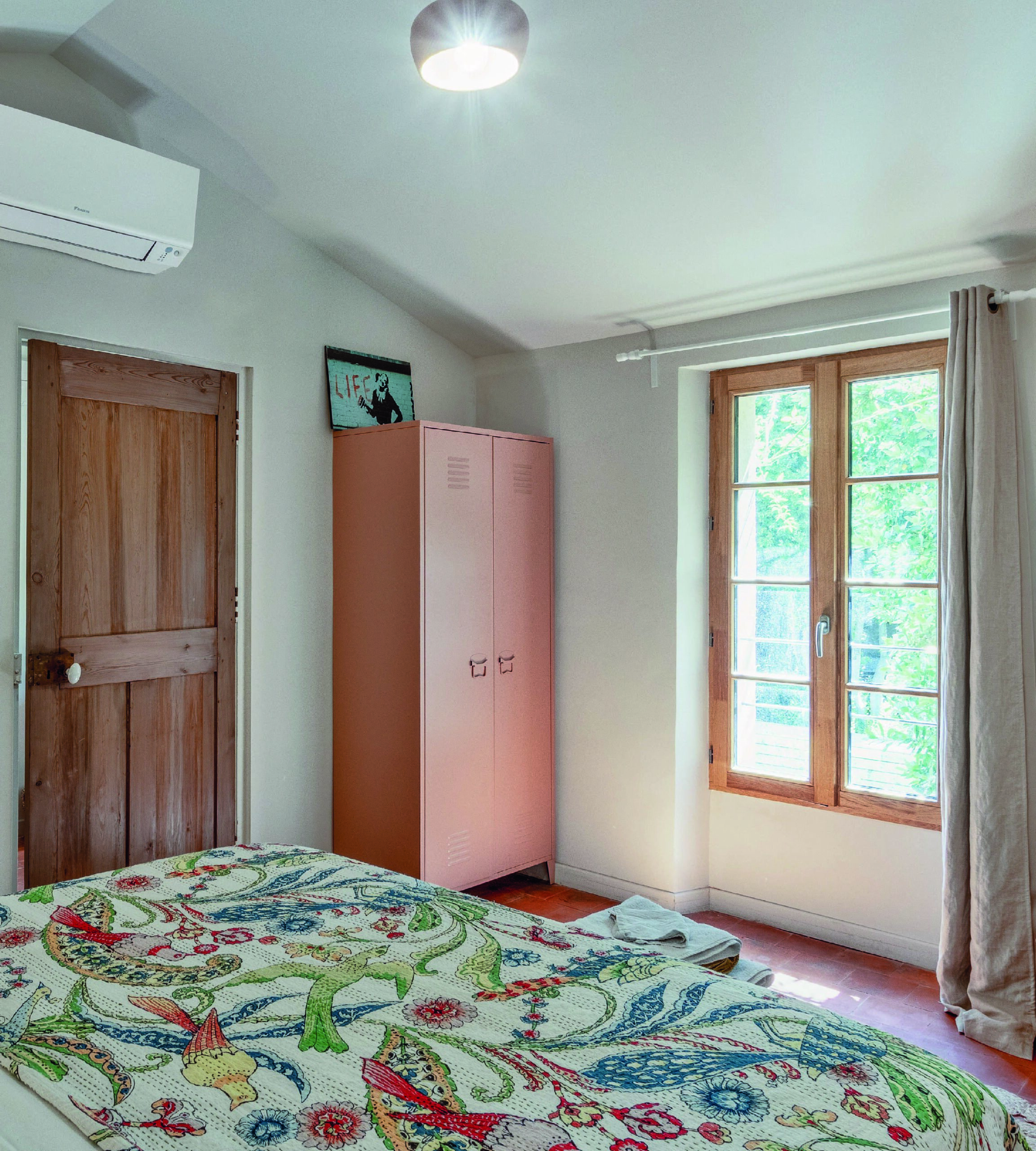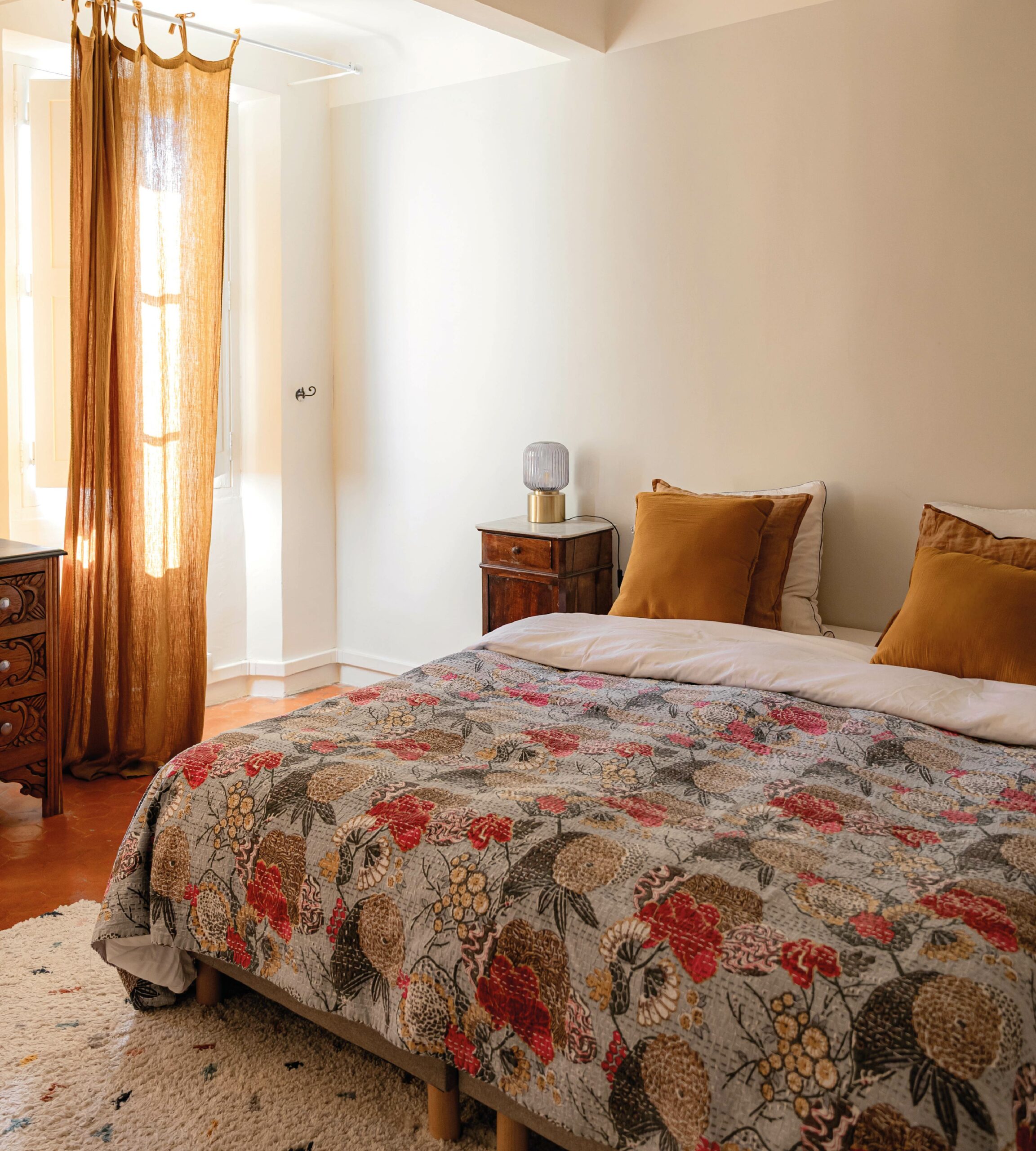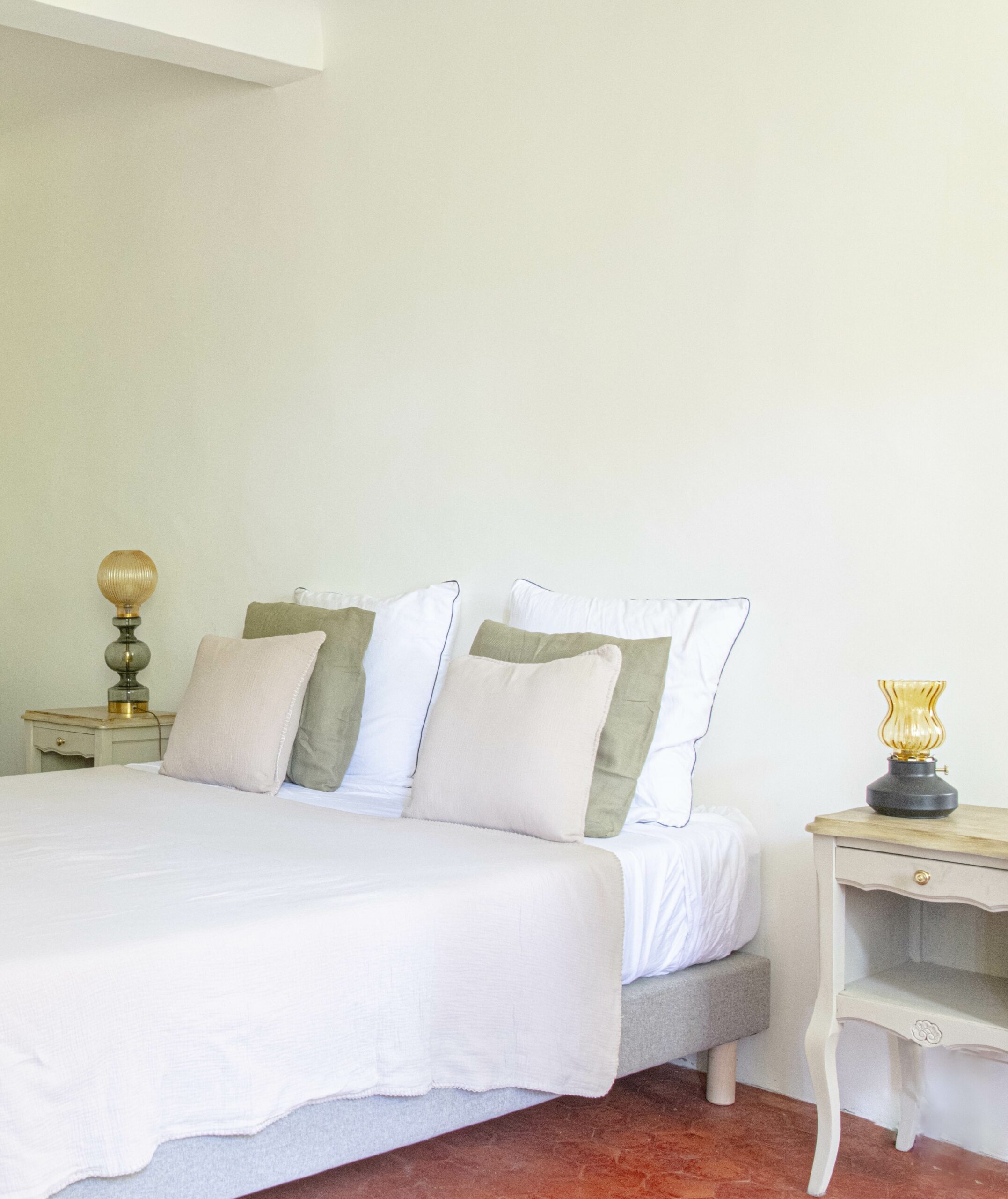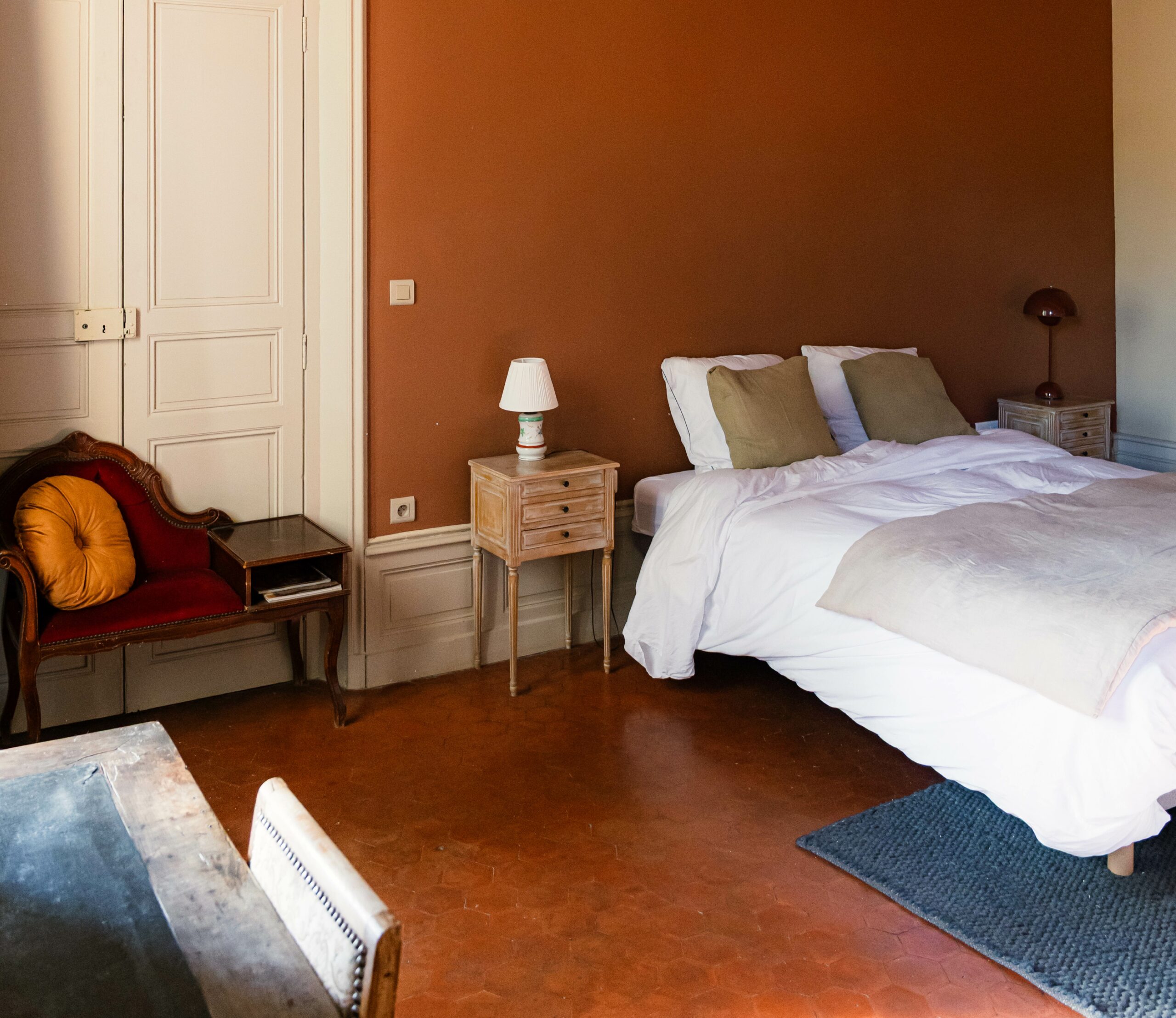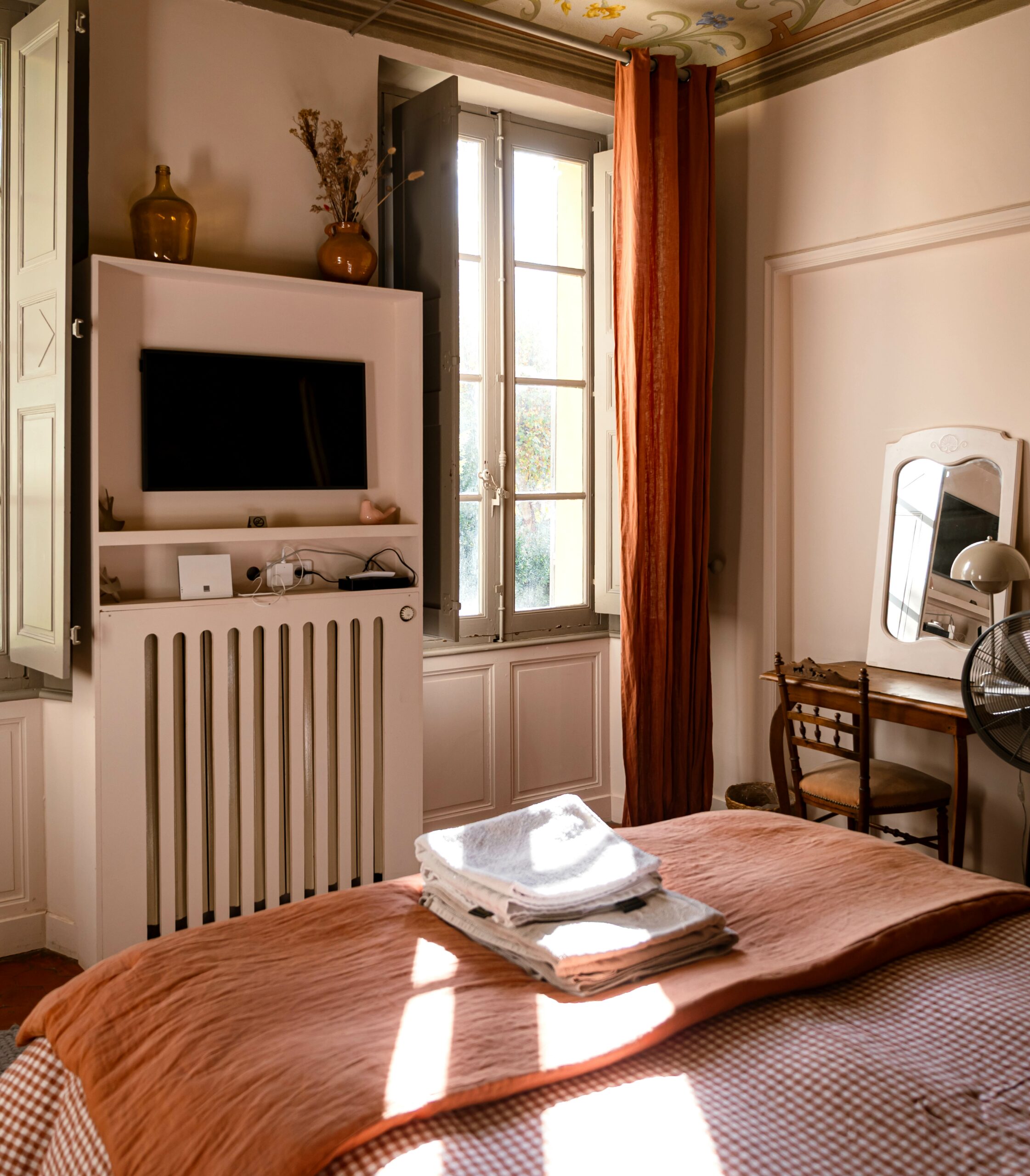 La chambre Aude se situe au 1er étage et offre une ambiance tournée vers l’Italie. Le plafond, aux décors soignés, se marie à merveille avec le mur couleur terracotta et les tomettes anciennes.