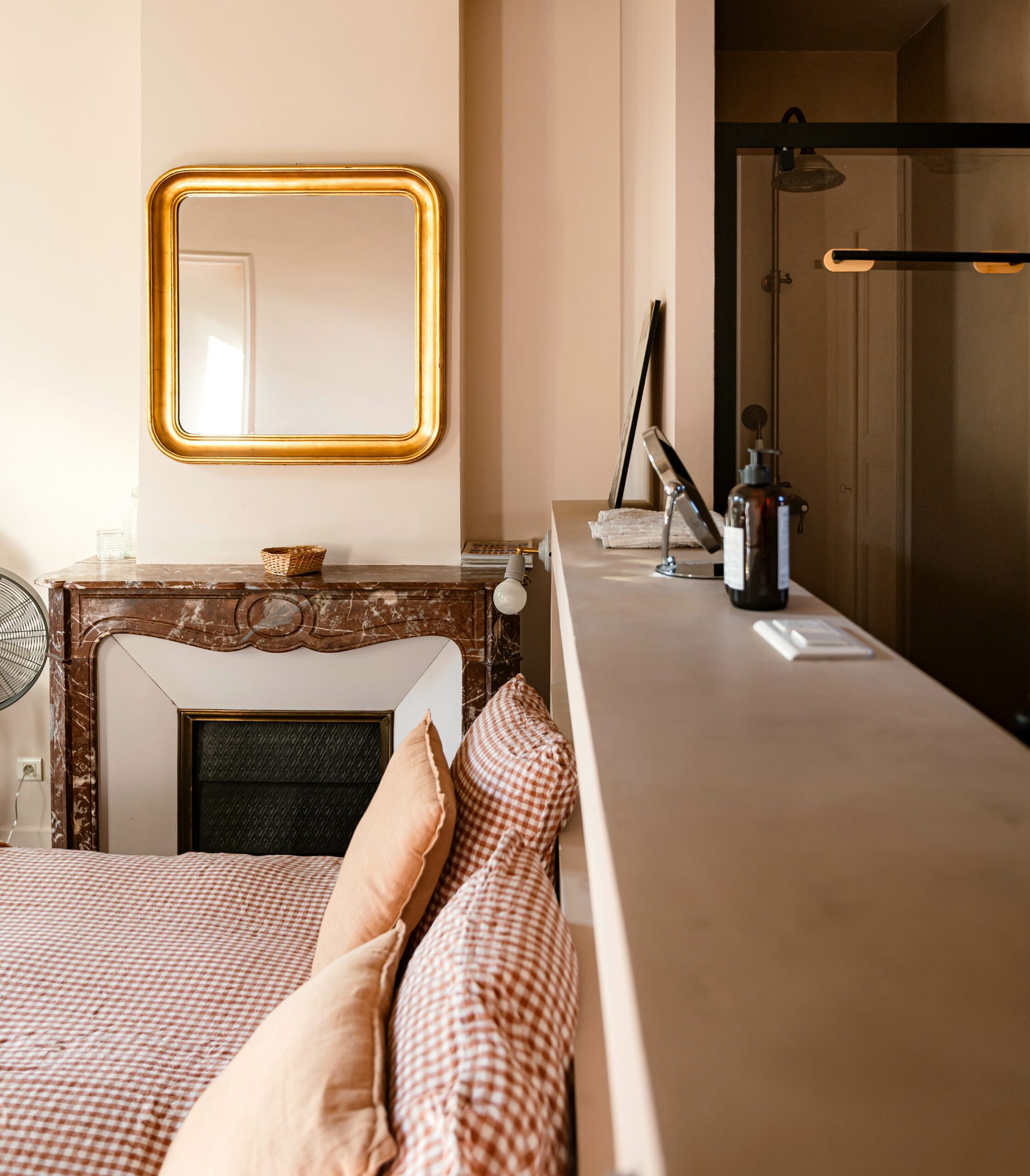 Dans le prolongement de la chambre se trouve une grande salle de bain avec sa baignoire sur pieds, un coin W-C et une vasque en porcelaine d’époque secrètement cachée.