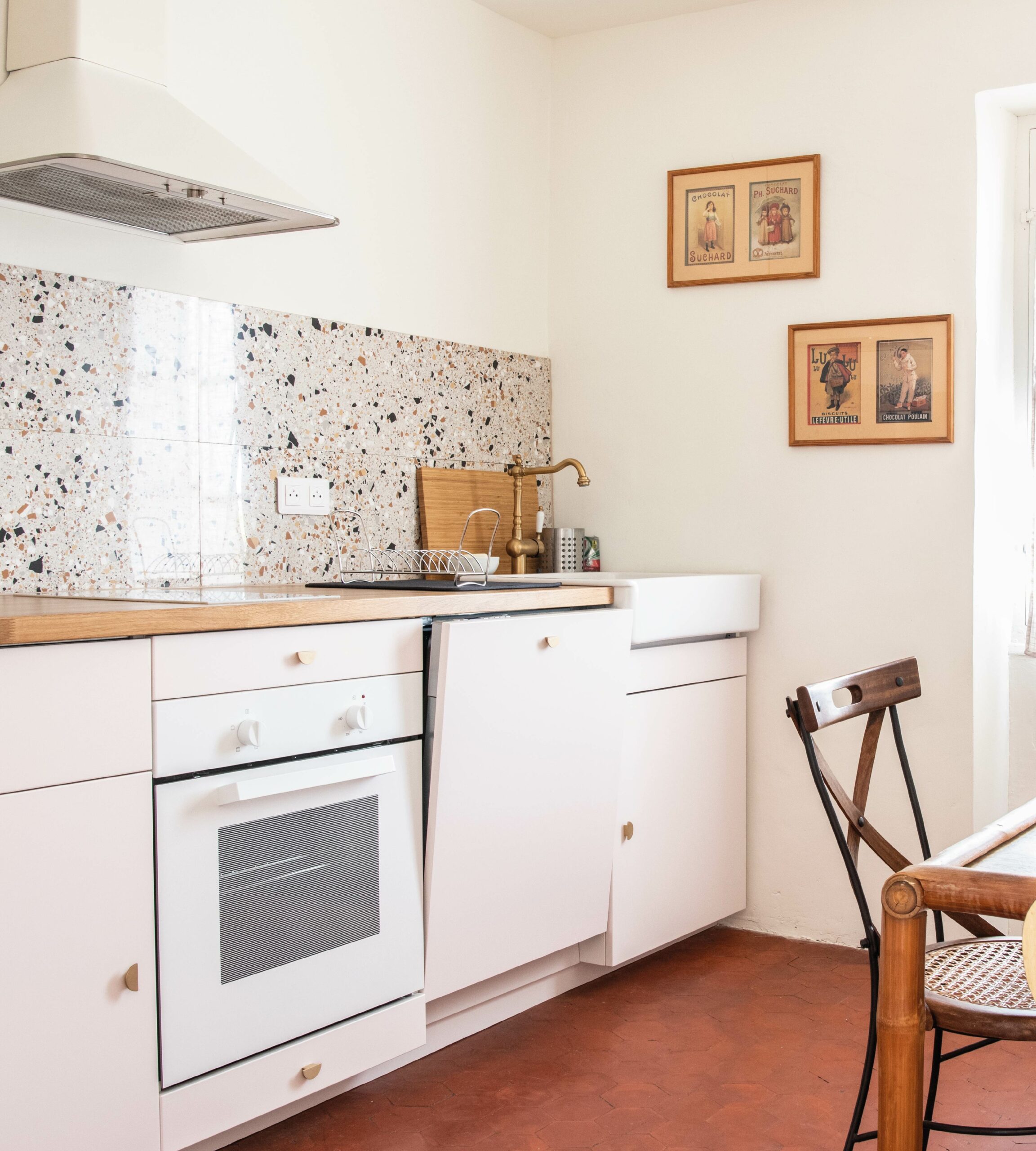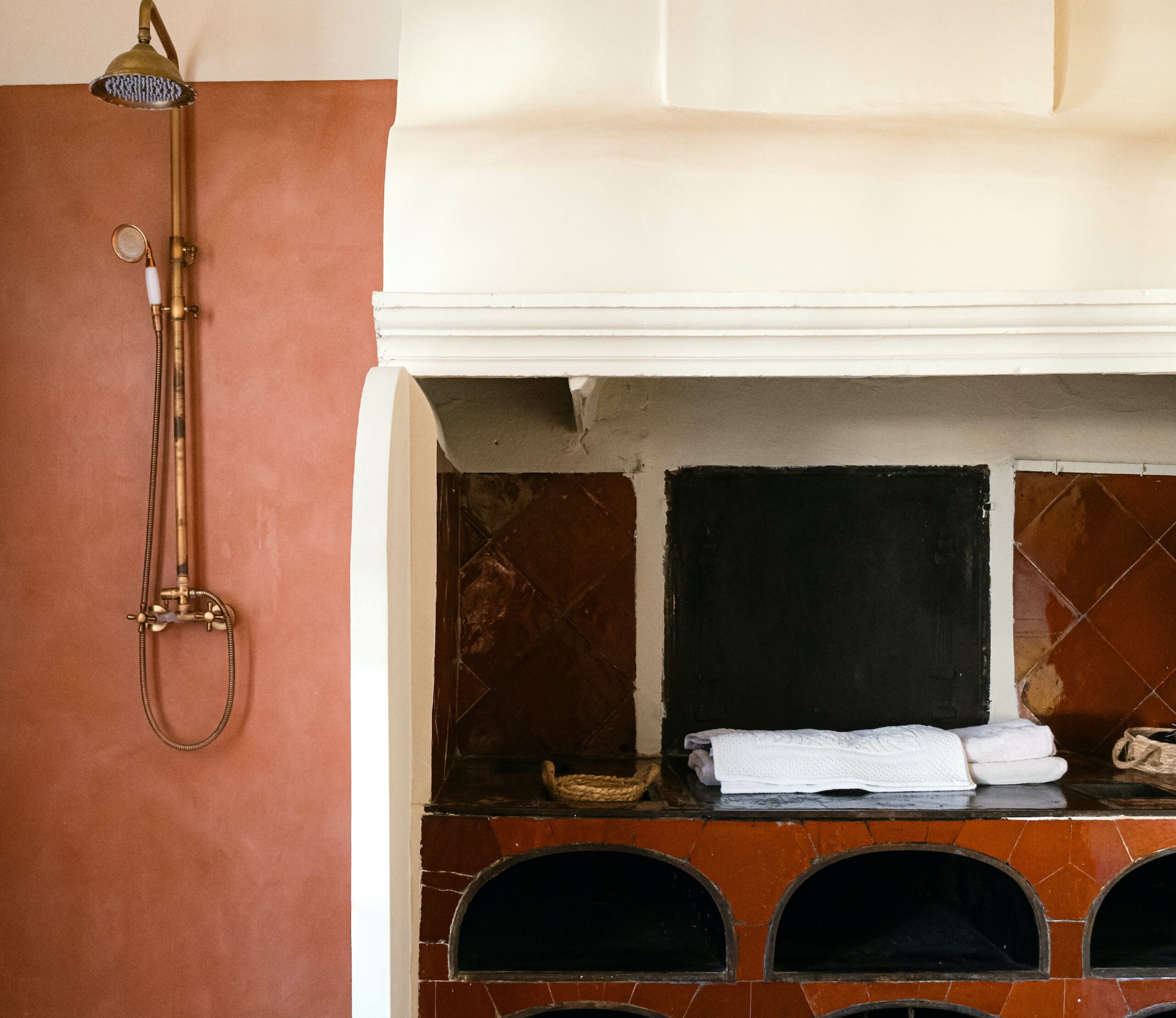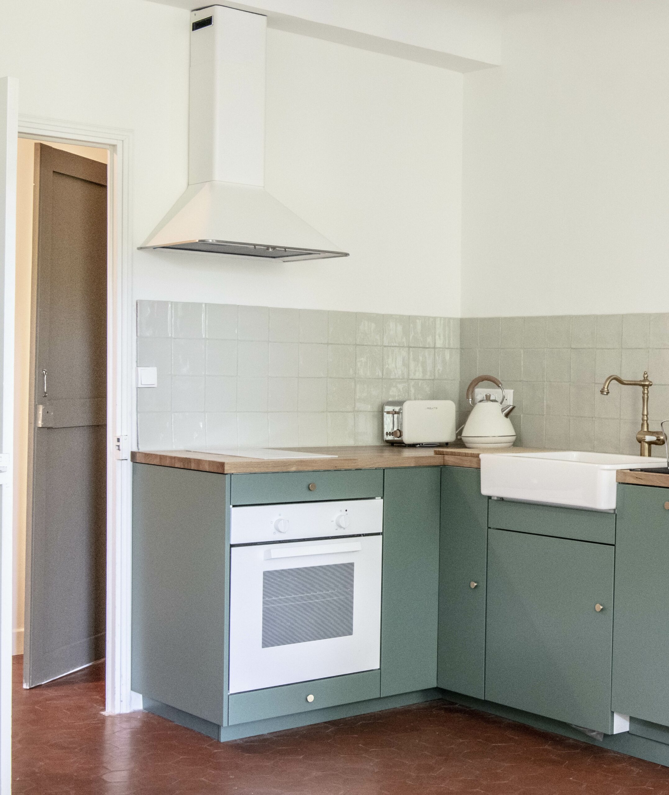 Sa salle de bain, avec baignoire et douche, se trouve dans l’ancienne cuisine de la maison dont les vestiges ont été conservés ( ancien four, évier en pierre d’époque…).
